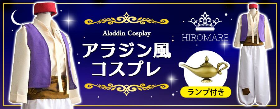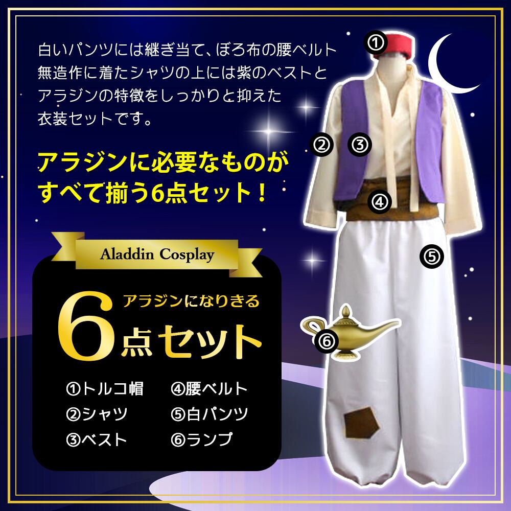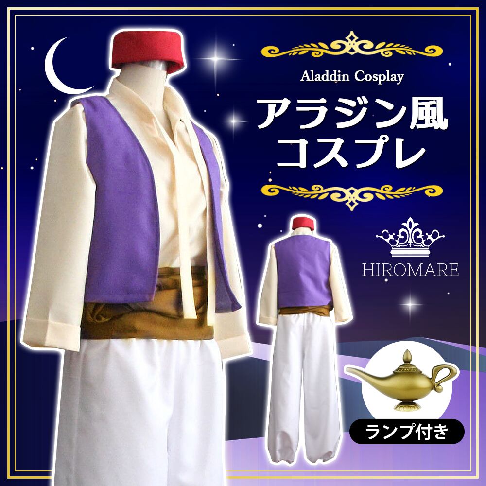【アラジン風コスプレ】ディズニー映画「アラジン」の主人公、アラジンを忠実に再現した衣装。白いパンツに継ぎ当て、ぼろ布の腰ベルト、無造作に着たシャツの上には紫のベストと、アラジンの特徴をしっかりと抑えた衣装です。カッコいいアラジンになりきってハロウィンやパーティー、学園祭の主人公になろう!