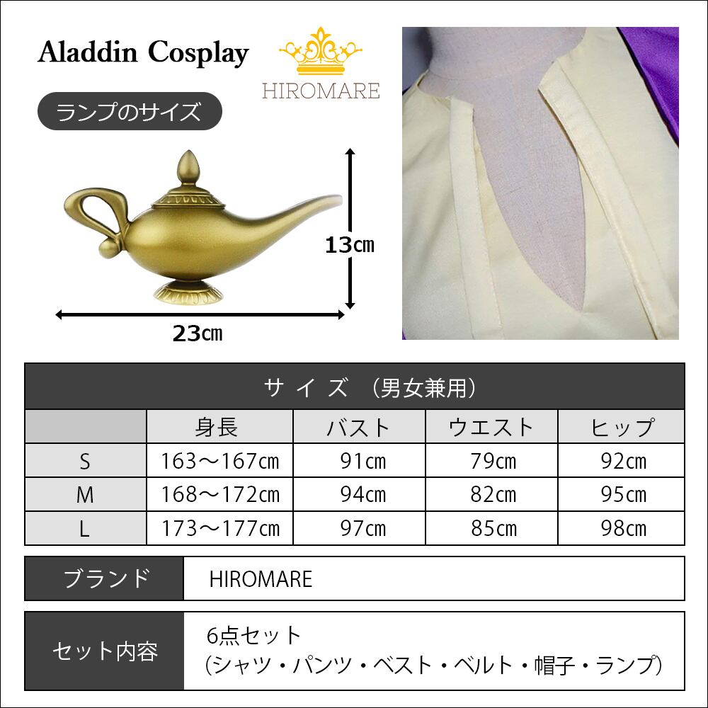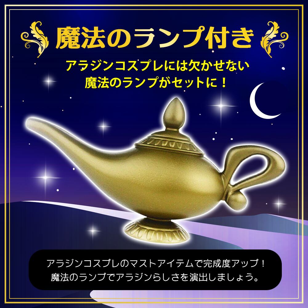 【魔法のランプ付き】アラジンコスプレには欠かせない魔法のランプがセットに。コスプレの完成度がグッと高まる、アラジンコスプレのマストアイテム。魔法のランプを手に持ち、アラジンらしさを演出しましょう。