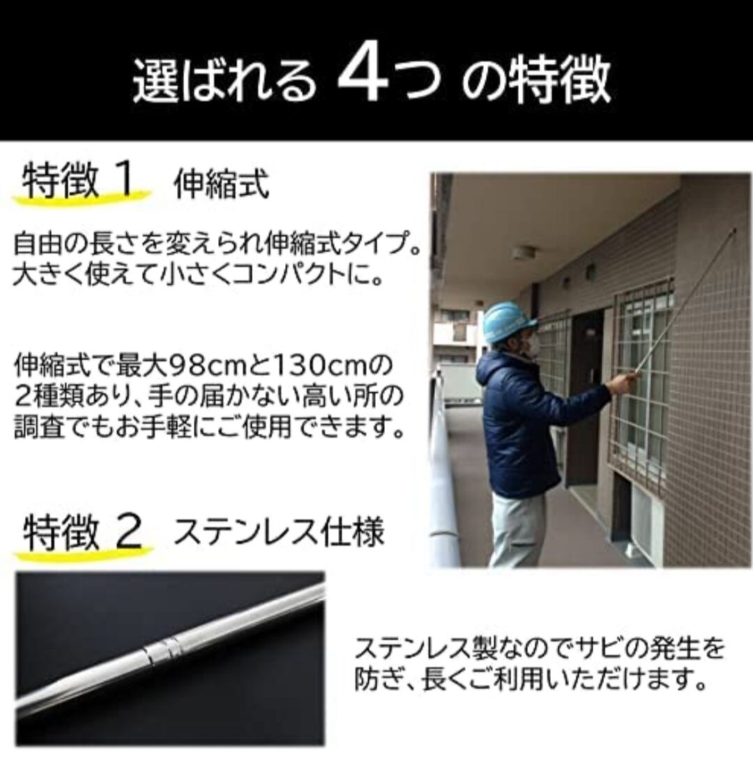 本製品の打診棒は、伸縮式で最大伸縮98cmと130cmの2種類ご用意しており、手の届かない天井などの調査でもお手軽に使用可能です。またこのテストハンマーは先端が球体式であり、コンクリートやモルタル素材など全般的に使用可能です。またタイルのような凹凸がある面にも向いています。建築業や不動産業の専門家の方はもちろん、リフォームやDIY初心者、または古家再建など不動産経営を営む方、新米大家さんなどさまざまな方にお使いいただけます。用途に合わせてお買い求め下さい。